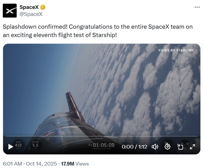 स्पेसएक्स ने मंगलवार (14 अक्टूबर) को सुबह 5:00 बजे टेक्सास के बोका चिका से अपने अब तक के सबसे बड़े रॉकेट स्टारशिप की 11वां सफल परीक्षण उड़ान पूरी की। इस उड़ान में रॉकेट ने आठ नकली उपग्रहों को अंतरिक्ष में छोड़ते हुए दुनिया के आधे हिस्से की यात्रा की। चरण पृथक्करण के बाद उसका सुपर हैवी बूस्टर सुरक्षित रूप से मैक्सिको की खाड़ी में उतरा, जिससे यह साबित हुआ कि स्पेसएक्स अपने रॉकेट की वापसी और पुनः उपयोग की दिशा में लगातार प्रगति कर रहा है।