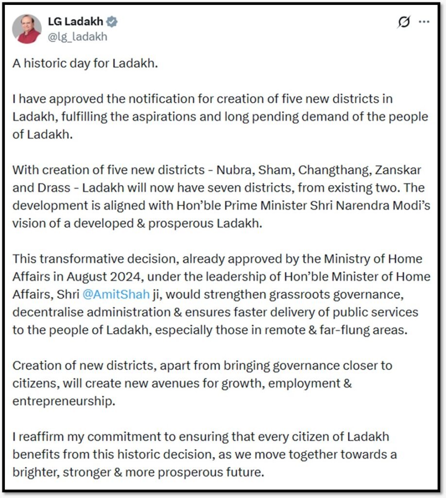 नए जिलों का गठन उसी प्रक्रिया का अगला कदम माना जा रहा है। इससे यह साफ होता है कि सरकार लद्दाख को एक मजबूत और आत्मनिर्भर क्षेत्र बनाना चाहती है।