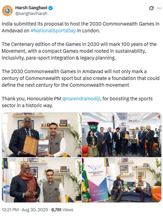 भारत ने कॉमनवेल्थ गेम्स 2030 की मेज़बानी के लिए इस साल 29 अगस्त को लंदन में बोली लगाई थी। इस अवसर पर गुजरात सरकार के खेल मंत्री हर्ष सांघवी ने प्रस्ताव कॉमनवेल्थ स्पोर्ट्स के सामने पेश किया। उन्होंने बताया कि अहमदाबाद कॉम्पैक्ट सिटी मॉडल पर गेम्स की मेज़बानी करेगा, यानी खेल स्थलों, प्रशिक्षण सुविधाओं और खिलाड़ियों के आवास सभी एक-दूसरे के पास होंगे। इससे खिलाड़ियों, अधिकारियों और दर्शकों को बेहतर अनुभव मिलेगा।