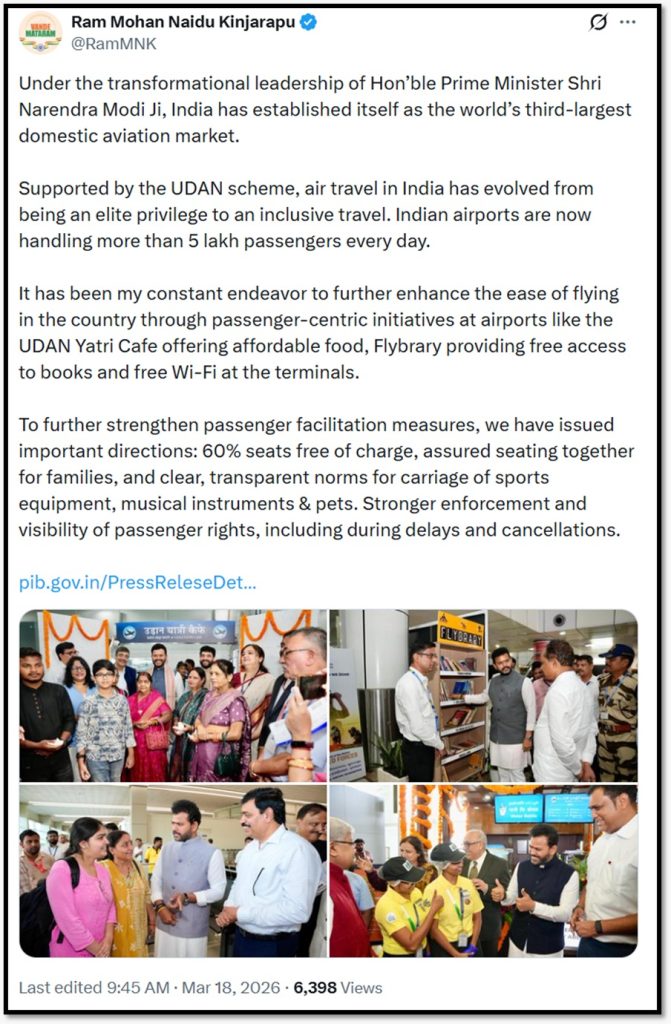 सरकार ने यात्रियों के अनुभव को बेहतर बनाने के लिए कई नई पहल भी शुरू की हैं। जैसे एयरपोर्ट्स पर UDAN यात्री कैफे के जरिए सस्ता खाना उपलब्ध कराया जा रहा है। इसके अलावा कुछ जगहों पर फ्री किताबें (Flybrary) और मुफ्त वाई-फाई जैसी सुविधाएं भी दी जा रही हैं।