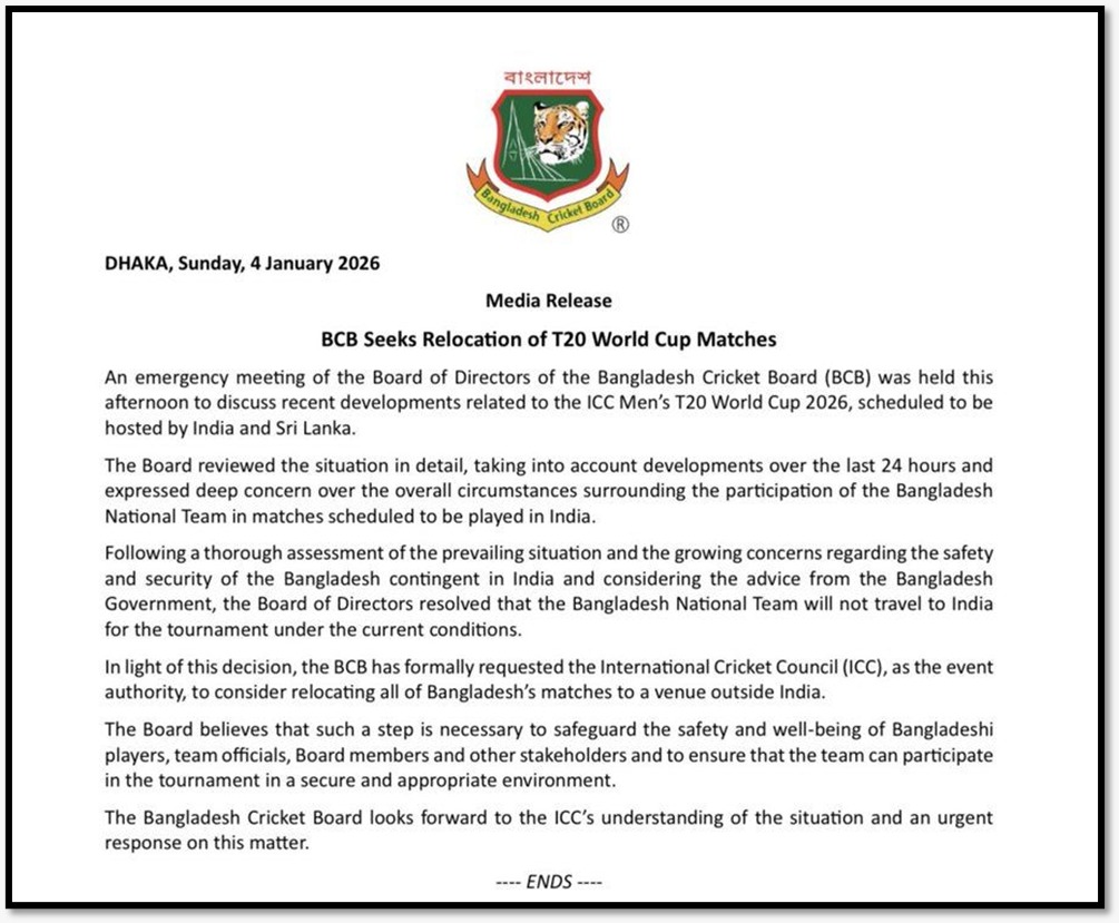 यह निर्णय ऐसे समय में आया है जब बांग्लादेशी क्रिकेटर मुस्तफिजुर रहमान को भारतीय क्रिकेट नियंत्रण बोर्ड (BCCI) के निर्देश पर इंडियन प्रीमियर लीग (IPL) से बाहर कर दिया गया था।