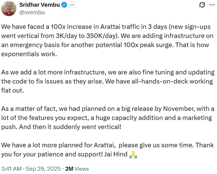 जोहो के को-फाउंडर श्रीधर वेम्बू ने सोशल मीडिया प्लेटफार्म X पर बताया कि Arattai ऐप पर सिर्फ 3 दिनों में 100 गुना ट्रैफिक बढ़ गया है। नए साइन-अप्स रोज़ाना 3,000 से बढ़कर 3.5 लाख हो गए हैं। इतनी तेजी से बढ़ती लोकप्रियता को संभालने के लिए कंपनी तुरंत अधिक सर्वर और इंफ्रास्ट्रक्चर जोड़ रही है। साथ ही कोड को फाइन-ट्यून और अपडेट किया जा रहा है ताकि आने वाली दिक्कतों को तुरंत ठीक किया जा सके। उन्होंने कहा कि टीम पूरी ताकत से लगातार काम कर रही है।