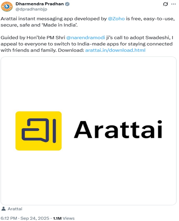 Arattai की मांग प्रधानमंत्री नरेंद्र मोदी के ‘स्वदेशी’ अभियान के चलते बढ़ी है। शिक्षा मंत्री धर्मेंद्र प्रधान और IT मंत्री अश्विनी वैष्णव ने भी Arattai और Zoho के प्रोडक्ट्स को सोशल मीडिया पर समर्थन दिया। 22 सितंबर को वैष्णव ने कहा कि वे अब डॉक्यूमेंट्स, स्प्रेडशीट्स और प्रेजेंटेशन के लिए Zoho टूल्स का इस्तेमाल करेंगे और हाल ही में कैबिनेट ब्रीफिंग Zoho Show पर की। इसके बाद सोशल मीडिया पर चर्चा तेज़ हो गई और यूजर्स ने Arattai को “WhatsApp Killer” कहना शुरू कर दिया।