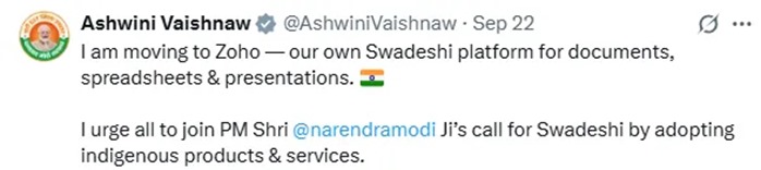 मैं ज़ोहो पर जा रहा हूँ – दस्तावेज़ों, स्प्रेडशीट और प्रस्तुतियों के लिए हमारा अपना स्वदेशी प्लेटफ़ॉर्म। मैं सभी से आग्रह करता हूँ कि स्वदेशी उत्पादों और सेवाओं को अपनाकर प्रधानमंत्री श्री नरेंद्र मोदी जी के स्वदेशी आह्वान में शामिल हों।