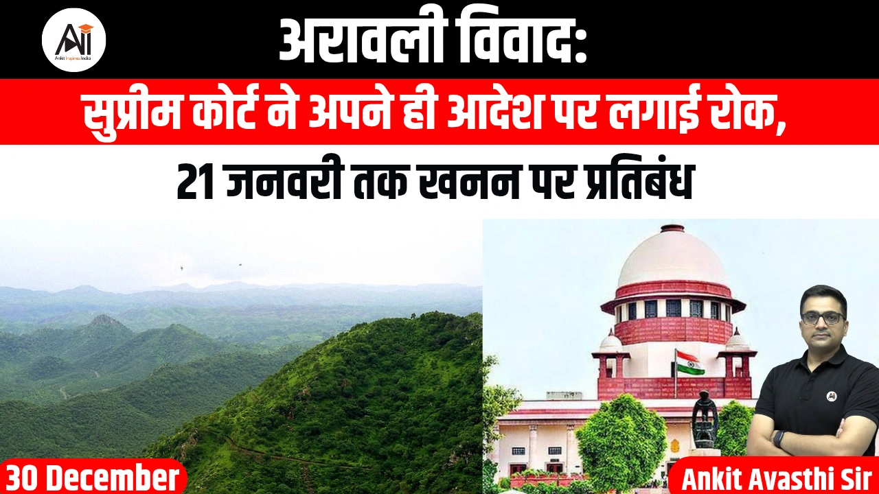 अरावली पर्वत श्रृंखला को लेकर उत्पन्न विवाद के मध्य सर्वोच्च न्यायालय ने अपने ही आदेश पर सोमवार को रोक लगा दी है। 20 नवंबर को जारी आदेश में 100 मीटर से कम ऊंचाई वाली पहाड़ियों पर खनन की अनुमति दी गई थी, परंतु अब 21 जनवरी 2026 तक खनन गतिविधियों पर पूर्ण प्रतिबंध आरोपित कर दिया गया है।