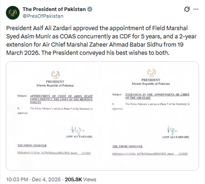 राष्ट्रपति कार्यालय ने कहा कि राष्ट्रपति आसिफ अली ज़रदारी ने प्रधानमंत्री द्वारा भेजे गए प्रस्ताव को मंजूरी दे दी है, जिसके तहत फील्ड मार्शल सैयद असीम मुनीर को पाँच साल के कार्यकाल के लिए रक्षा बलों का प्रमुख नियुक्त किया गया है।