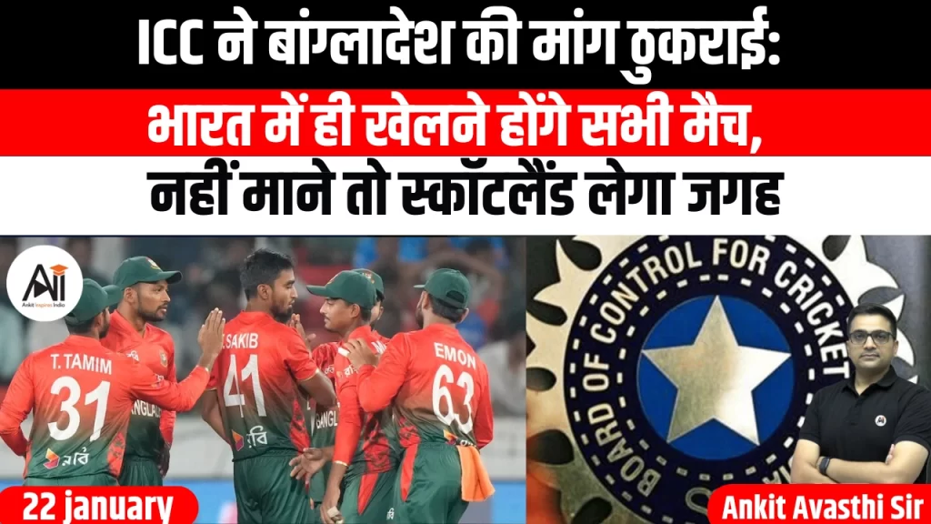अंतर्राष्ट्रीय क्रिकेट परिषद (ICC) ने बांग्लादेश क्रिकेट बोर्ड (BCB) की उस मांग को सख्ती से खारिज कर दिया है जिसमें टी-20 विश्व कप 2026 के मैचों को भारत की बजाय श्रीलंका में आयोजित करने की बात कही गई थी। ICC...