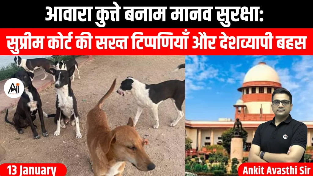 संदर्भ : भारत में आवारा कुत्तों से जुड़ा मुद्दा लंबे समय से सामाजिक, प्रशासनिक और भावनात्मक बहस का विषय रहा है। मंगलवार को भारत के सर्वोच्च न्यायालय में इस विषय पर सुनवाई के दौरान एक महत्वपूर्ण और संवेदनशील बहस सामने...