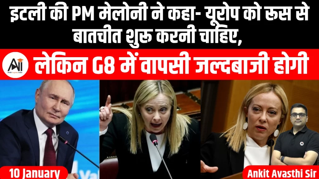 इटली की प्रधानमंत्री जियोर्जिया मेलोनी ने शुक्रवार को कहा कि यूरोप को रूस के साथ संवाद फिर से शुरू करना चाहिए। हालांकि, उन्होंने यह भी स्पष्ट किया कि मॉस्को को समूह-8 (G8) प्रमुख राष्ट्रों में वापस लाने की बात करना...