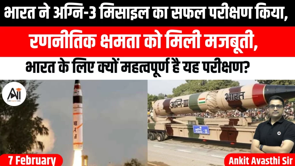 भारत ने शुक्रवार, 6 फरवरी 2026 को अपनी रणनीतिक सुरक्षा (Strategic Security) को और सुदृढ़ (Strengthen) करते हुए अग्नि-3 (Agni-3) इंटरमीडिएट रेंज बैलिस्टिक मिसाइल (Intermediate Range Ballistic Missile – IRBM) का सफल परीक्षण किया। यह परीक्षण ओडिशा के चांदीपुर स्थित...