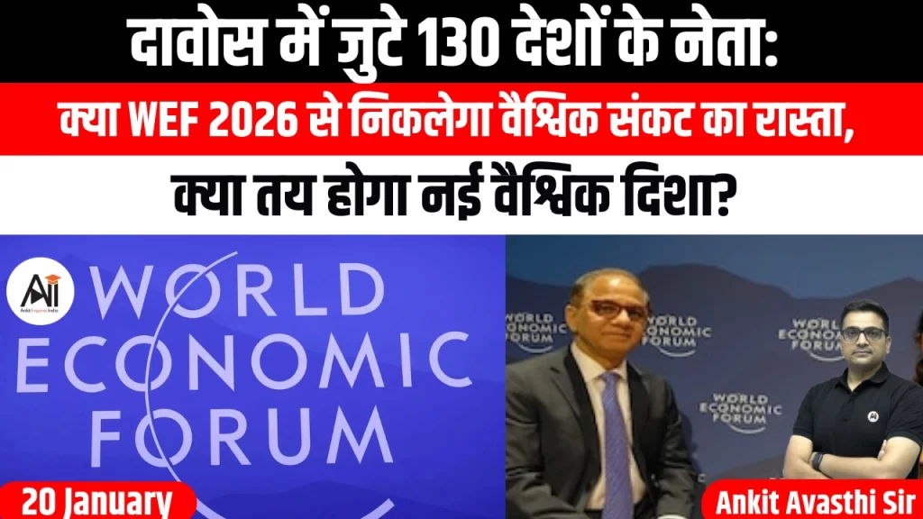 विश्व आर्थिक मंच (WEF) की वार्षिक बैठक 2026 का आयोजन 19 जनवरी से स्विट्जरलैंड के दावोस में प्रारंभ हो चुका है। पांच दिवसीय इस शिखर सम्मेलन में वैश्विक मंदी, भू-राजनीतिक संघर्ष, जलवायु संकट और तकनीकी परिवर्तन जैसे महत्वपूर्ण मुद्दों पर...