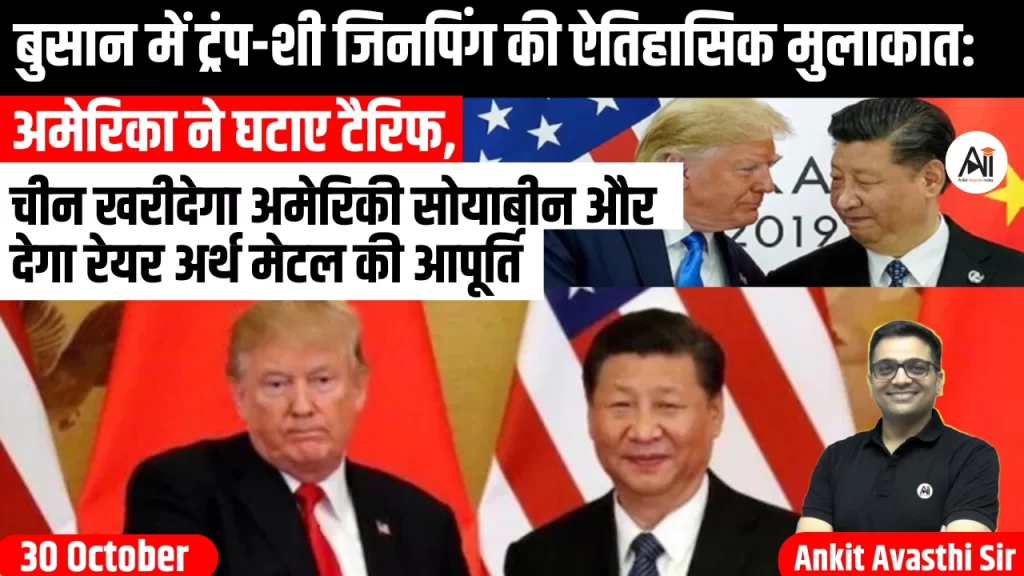 अमेरिकी राष्ट्रपति डोनाल्ड ट्रंप और चीनी राष्ट्रपति शी जिनपिंग ने 30 अक्टूबर 2025 (गुरुवार) को दक्षिण कोरिया के बुसान शहर में आमने-सामने मुलाकात की। बैठक 100 मिनट तक चली। यह बैठक एशिया-प्रशांत आर्थिक सहयोग (APEC) शिखर सम्मेलन के दौरान आयोजित...