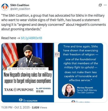 सिख गठबंधन ने सोशल मीडिया प्लेटफॉर्म X पर बयान जारी कर कहा- “हम रक्षा सचिव के इस फैसले से नाराज हैं और गहरी चिंता जताते हैं। यह नियम सिख सैनिकों के धार्मिक चिन्ह, जैसे दाढ़ी और पगड़ी, पहनने के अधिकार को छीनता है।”
