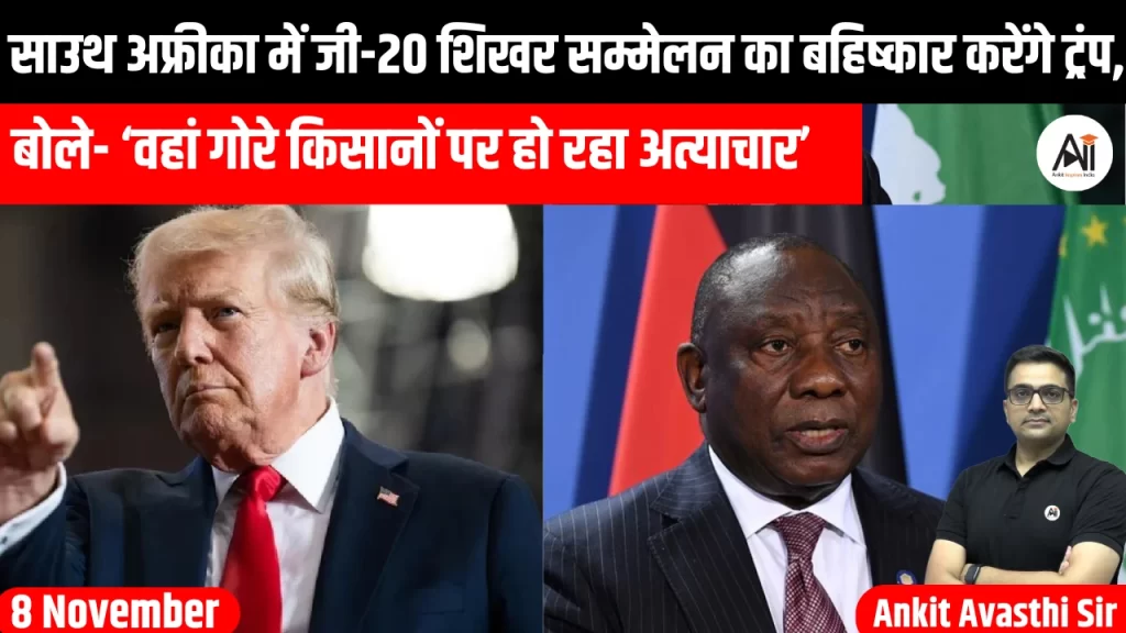 अमेरिकी राष्ट्रपति डोनाल्ड ट्रंप ने शुक्रवार को घोषणा की कि इस महीने साउथ अफ्रीका में होने वाले जी-20 शिखर सम्मेलन में कोई भी अमेरिकी सरकारी अधिकारी शामिल नहीं होगा। ट्रंप ने इस निर्णय के पीछे साउथ अफ्रीका में गोरे किसानों...