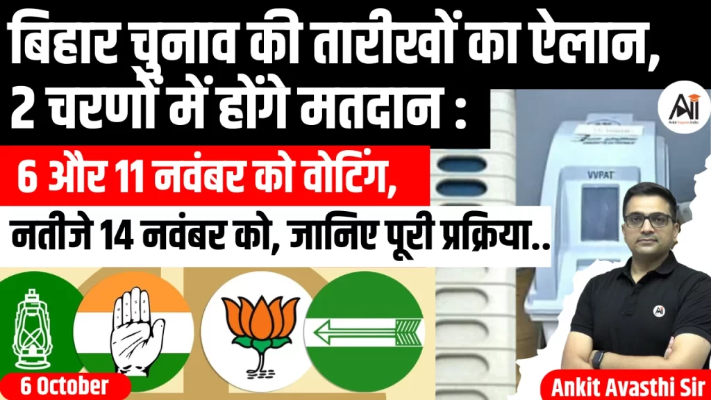 निर्वाचन आयोग ने सोमवार शाम 4 बजे प्रेस कॉन्फ्रेंस कर बिहार विधानसभा चुनाव 2025 की तारीखों की घोषणा कर दी है। इस बार चुनाव दो चरणों में होंगे- पहला चरण 6 नवंबर को और दूसरा चरण 11 नवंबर को। ...