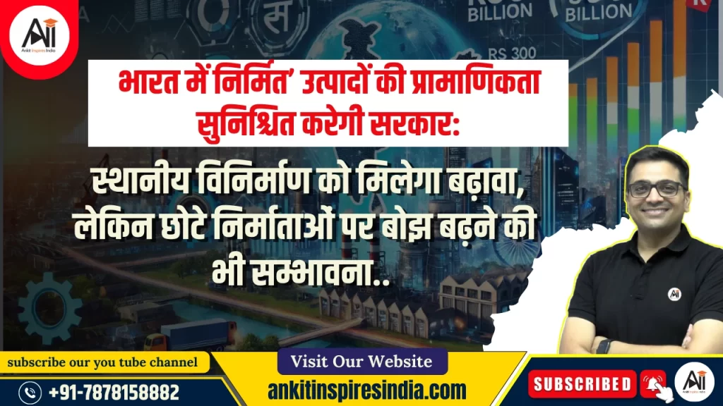 भारत सरकार यह सुनिश्चित करने के लिए सक्रिय कदम उठा रही है कि “मेड इन इंडिया” लेबल वाले सभी उत्पाद निर्धारित गुणवत्ता मानकों का पालन करें। इसके लिए उद्योग और आंतरिक व्यापार संवर्धन विभाग (DPIIT) और उपभोक्ता मामलों का विभाग...