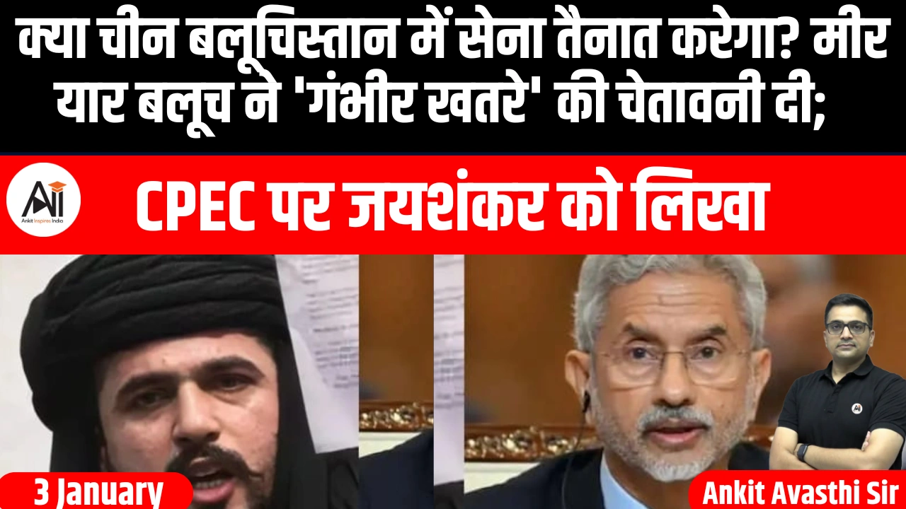 बलूचिस्तान की स्वतंत्रता के लिए संघर्षरत नेता मीर यार बलूच ने विदेश मंत्री एस जयशंकर को एक खुला पत्र लिखकर गंभीर चेतावनी दी है। नए साल के अवसर पर सोशल मीडिया प्लेटफॉर्म X पर साझा किए गए इस पत्र में उन्होंने कहा है कि चीन और पाकिस्तान के बढ़ते सैन्य सहयोग से उत्पन्न खतरे को गंभीरता से लेना चाहिए। उनका दावा है कि आने वाले महीनों में चीन बलूचिस्तान क्षेत्र में अपनी सैन्य टुकड़ियां तैनात कर सकता है।
