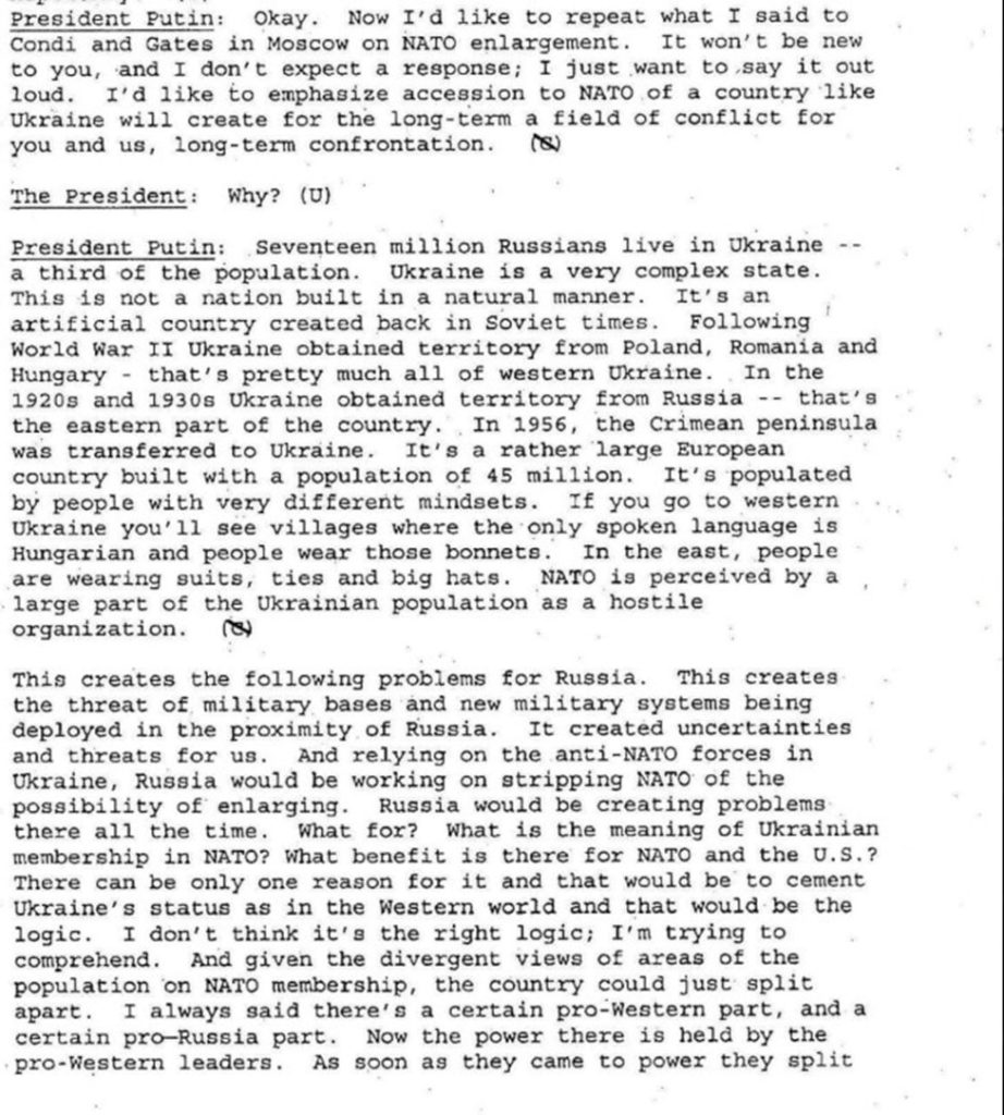 नेशनल सिक्योरिटी आर्काइव द्वारा जारी ये दस्तावेज 2001 से 2008 के मध्य पुतिन और बुश के बीच हुई बैठकों और टेलीफोन वार्तालापों को समेटे हुए हैं। इन अभिलेखों से स्पष्ट होता है कि पुतिन यूक्रेन को स्वाभाविक रूप से निर्मित राष्ट्र के बजाय सोवियत युग की क्षेत्रीय इंजीनियरिंग का उत्पाद मानते रहे हैं।
