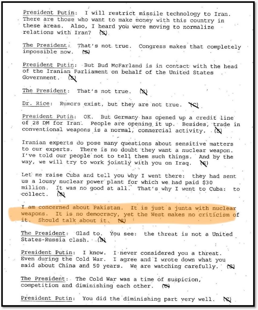 इन्हीं दस्तावेजों में एक अन्य महत्वपूर्ण खुलासा पाकिस्तान के परमाणु कार्यक्रम को लेकर है। 2001 में अमेरिका के तत्कालीन राष्ट्रपति जॉर्ज बुश से अपनी प्रथम मुलाकात के दौरान पुतिन ने पाकिस्तान को लेकर गंभीर चिंता व्यक्त की थी।
