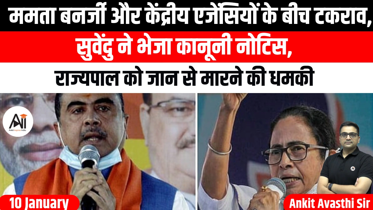 पश्चिम बंगाल में राजनीतिक संकट गहराता जा रहा है। मुख्यमंत्री ममता बनर्जी और केंद्रीय जांच एजेंसियों के बीच जारी टकराव ने नया मोड़ ले लिया है। विपक्ष के नेता सुवेंदु अधिकारी ने शुक्रवार को सीएम ममता को कानूनी नोटिस भेजकर 72 घंटे में सबूत देने की मांग की है। इस बीच, राज्यपाल सीवी आनंद बोस को जान से मारने की धमकी मिलने से माहौल और तनावपूर्ण हो गया है।