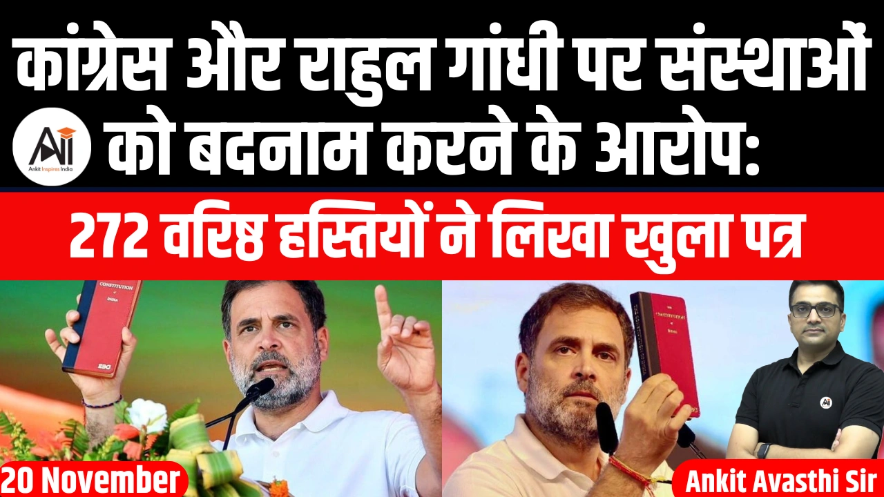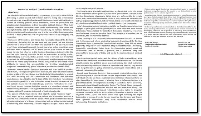देश के 272 प्रतिष्ठित नागरिकों-जिनमें 16 जज, 123 पूर्व IAS-IPS अधिकारी, 14 पूर्व राजदूत और 133 सेवानिवृत्त सैन्य अधिकारी शामिल हैं- उन्होंने एक खुला पत्र जारी कर विपक्ष के नेता राहुल गांधी और कांग्रेस पर संवैधानिक संस्थाओं, खासकर चुनाव आयोग, की विश्वसनीयता कमजोर करने का आरोप लगाया है।