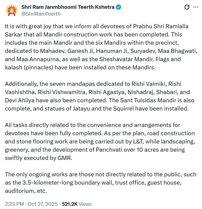 उन्हें यह बताते हुए बहुत खुशी हो रही है कि श्री रामलला मंदिर का पूरा निर्माण कार्य अब पूरा हो गया है। इसमें मुख्य मंदिर के साथ-साथ परिसर में बने महादेव, गणेश जी, हनुमान जी, सूर्यदेव, माँ भगवती, माँ अन्नपूर्णा और शेषावतार भगवान को समर्पित मंदिर शामिल हैं। इन सभी मंदिरों पर ध्वज और कलश भी स्थापित कर दिए गए हैं।साथ ही ट्रस्ट ने बताया कि संत तुलसीदास मंदिर के अलावा ऋषि वाल्मिकी, ऋषि वशिष्ठ, ऋषि विश्वामित्र, ऋषि अगस्त्य, निषादराज, शबरी और देवी अहिल्या के लिए सात मंडप बनाए गए हैं। साथ ही जटायु और गिलहरी की सुंदर मूर्तियाँ भी स्थापित की गई हैं।