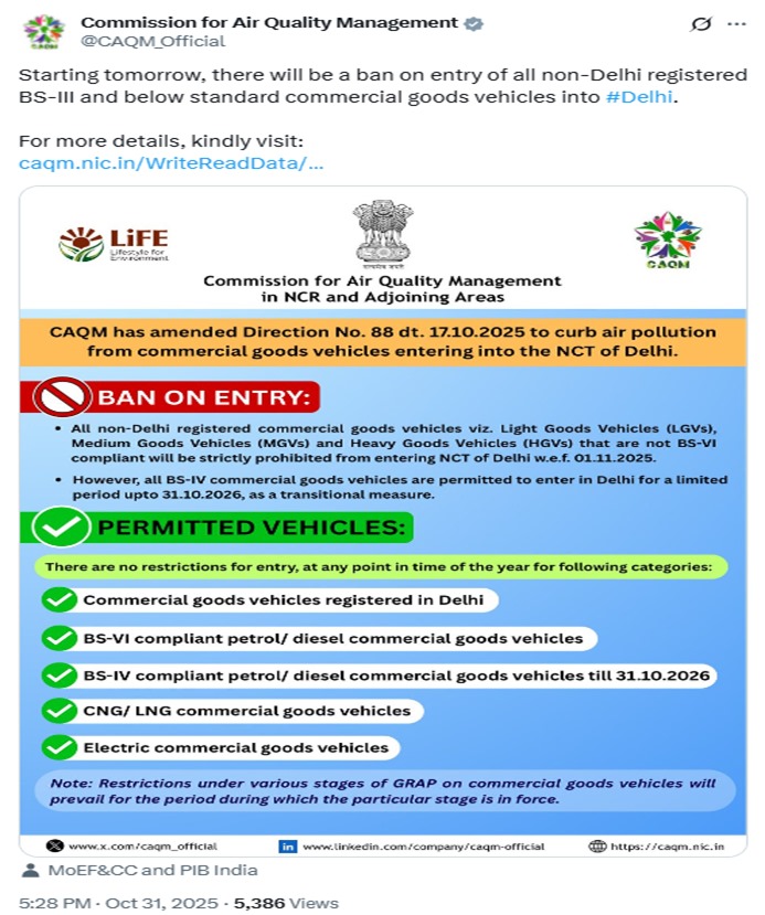 वायु गुणवत्ता प्रबंधन आयोग (CAQM) ने 17 अक्टूबर को हुई बैठक में फैसला किया कि 1 नवंबर से दिल्ली में प्रदूषण फैलाने वाले वाणिज्यिक मालवाहक वाहनों के प्रवेश पर रोक लगाई जाएगी। यह कदम अक्टूबर के अंत में शुरू होने वाले प्रदूषण के मौसम में हवा की गुणवत्ता सुधारने और सड़क परिवहन, निर्माण धूल व बायोमास जलाने से होने वाले प्रदूषण को कम करने की व्यापक रणनीति का हिस्सा है।
