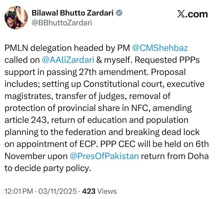 दिलचस्प बात यह है कि इस प्रस्तावित 27वें संविधान संशोधन की जानकारी सबसे पहले पीपीपी प्रमुख बिलावल भुट्टो-ज़रदारी के एक ट्वीट के जरिए सामने आई। उन्होंने बताया कि प्रधानमंत्री शहबाज शरीफ ने उनकी पार्टी से इस संशोधन पर समर्थन मांगा है।