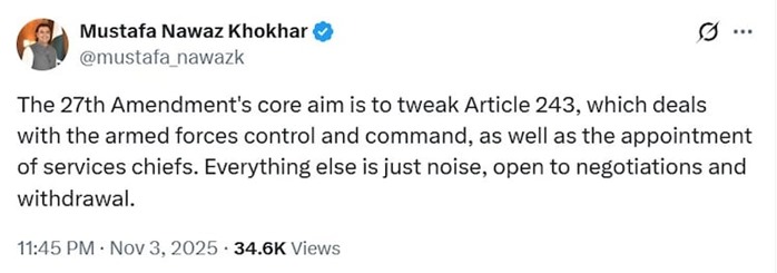 - पूर्व पाकिस्तानी सीनेटर मुस्तफा नवाज़ खोखर ने कहा कि 27वें संशोधन का असली मकसद अनुच्छेद 243 में बदलाव करना है, बाकी सब बातें ध्यान भटकाने के लिए हैं।