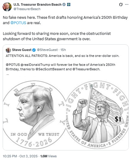 अमेरिका के ट्रेजरर ब्रैंडन बीच ने सोशल मीडिया प्लेटफॉर्म ‘एक्स’ पर संभावित सिक्के की इमेज साझा करते हुए लिखा, “यह कोई फर्जी खबर नहीं है। अमेरिका की 250वीं वर्षगांठ और राष्ट्रपति का सम्मान करने वाले ये पहले ड्राफ्ट रियल हैं। शटडाउन खत्म होने के बाद जल्द ही इस बारे में और जानकारी साझा करने की उम्मीद है।” ट्रेजरी विभाग का कहना है कि ये डिजाइन देश की मजबूत और अडिग भावना को दर्शाता है, हालांकि अंतिम डिजाइन पर फिलहाल फैसला नहीं हुआ है।