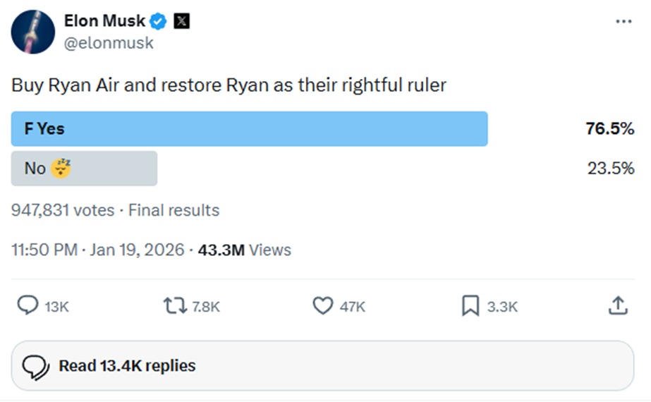 मस्क ने स्थिति में हास्य और शब्दों का खेल भी जोड़ा। उन्होंने सुझाव दिया कि Ryanair को किसी ऐसे व्यक्ति द्वारा चलाया जाना चाहिए जिसका नाम Ryan हो। एक पोस्ट में उन्होंने लिखा कि वे “Ryan को उनके वैध शासक के रूप में बहाल” करना चाहते हैं और यह कि “यह आपकी नियति है।” इन टिप्पणियों को व्यापक रूप से शेयर किया गया, जिसने पोल को और अधिक गति दी।