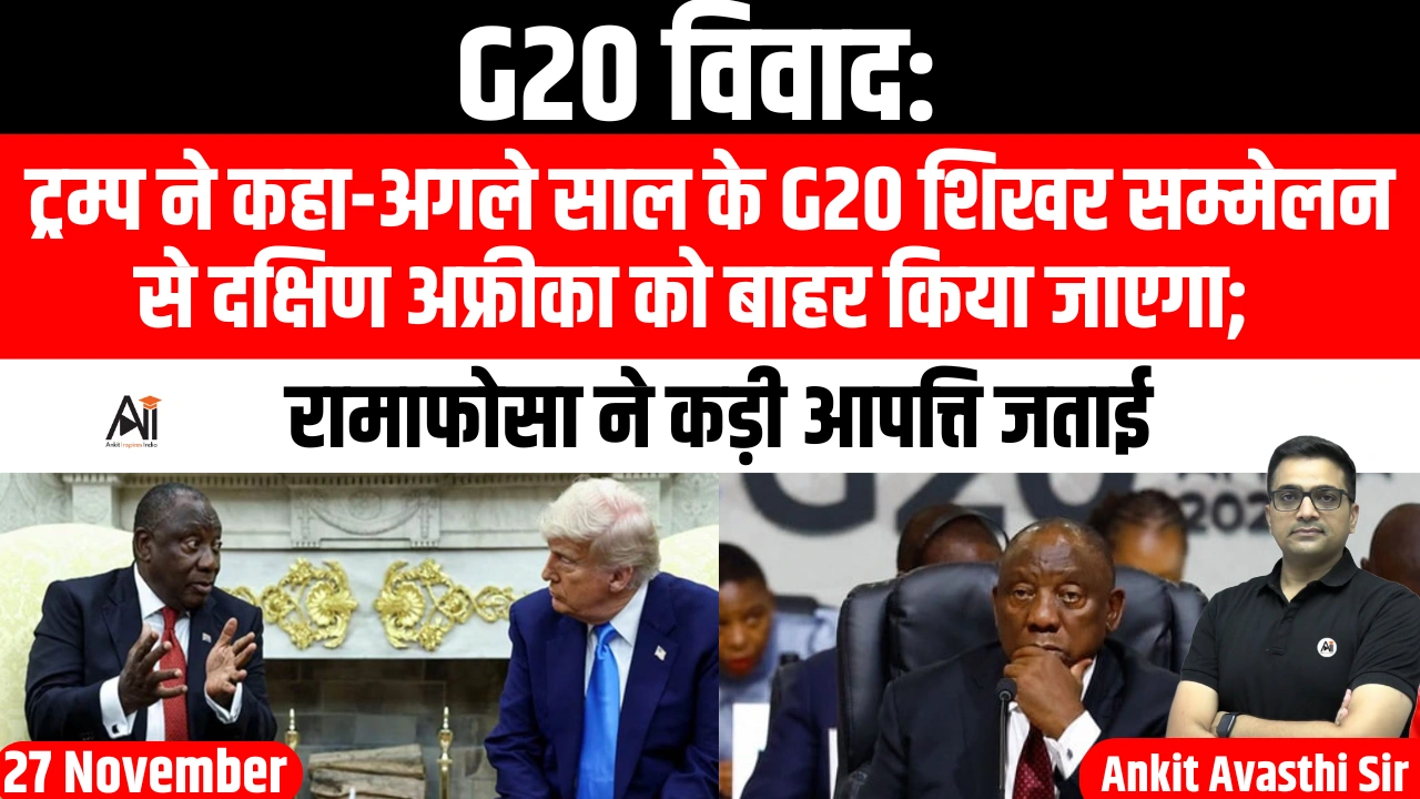 डोनाल्ड ट्रम्प के बयान ने अमेरिका–दक्षिण अफ्रीका संबंधों में नई तनातनी पैदा कर दी है। हालाँकि ट्रम्प ने G20 से दक्षिण अफ्रीका को बाहर करने की धमकी दी है, लेकिन अंतरराष्ट्रीय नियम स्पष्ट हैं G20 किसी एक देश की संपत्ति नहीं है, और कोई भी सदस्य अकेले किसी अन्य सदस्य को बाहर नहीं कर सकता।