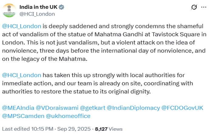 लंदन में गांधी प्रतिमा के साथ हुई तोड़फोड़ अहिंसा और शांति के प्रतीक पर सीधा आघात है। दोषियों पर सख्त कार्रवाई जरूरी है, ताकि भविष्य में ऐसी घटनाएं दोबारा न हों। गांधीजी की विरासत आज भी दुनिया को सहिष्णुता और शांति का संदेश देती है।