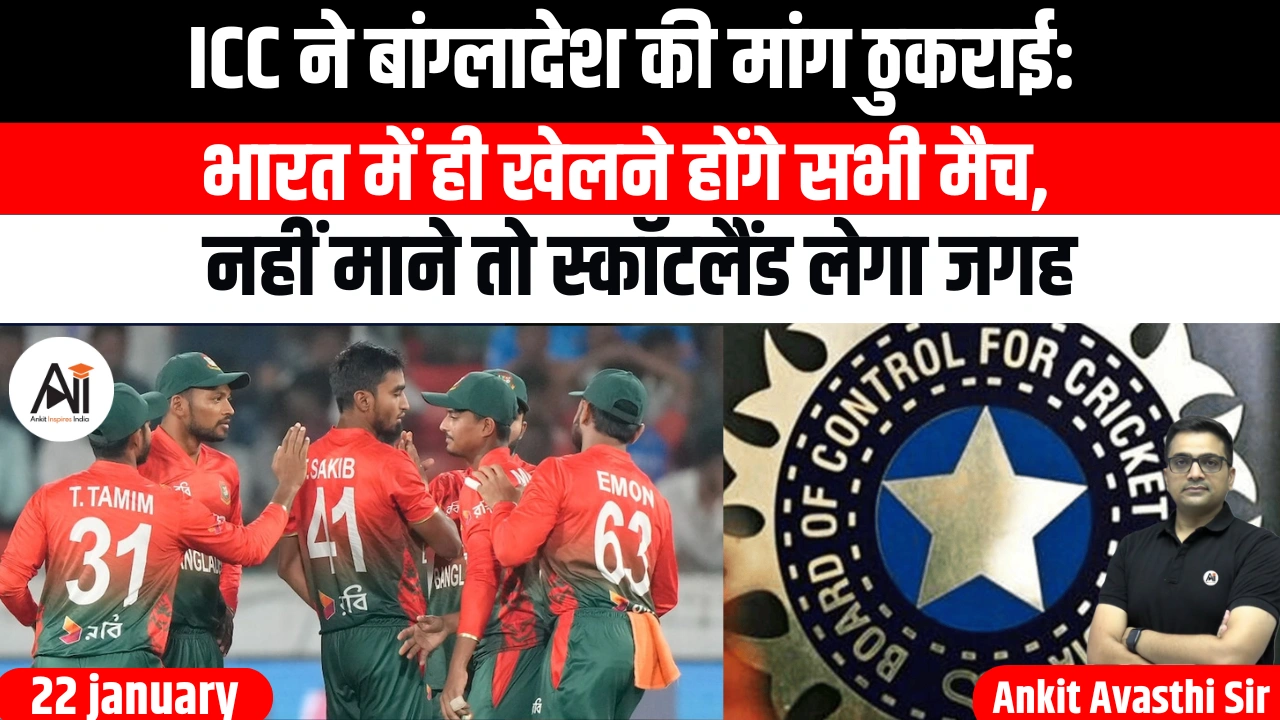 अंतर्राष्ट्रीय क्रिकेट परिषद (ICC) ने बांग्लादेश क्रिकेट बोर्ड (BCB) की उस मांग को सख्ती से खारिज कर दिया है जिसमें टी-20 विश्व कप 2026 के मैचों को भारत की बजाय श्रीलंका में आयोजित करने की बात कही गई थी। ICC ने स्पष्ट कर दिया है कि टूर्नामेंट के शेड्यूल में किसी प्रकार का बदलाव नहीं किया जाएगा।