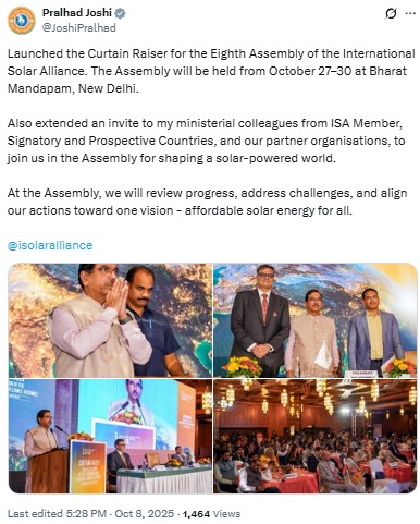 अंतर्राष्ट्रीय सौर गठबंधन (ISA) की आठवीं महासभा के कर्टेन रेज़र कार्यक्रम के अवसर पर भारत सरकार के नवीन एवं नवीकरणीय ऊर्जा मंत्रालय (MNRE) के सचिव ने भारत की अक्षय ऊर्जा क्षेत्र में उल्लेखनीय प्रगति को रेखांकित किया।