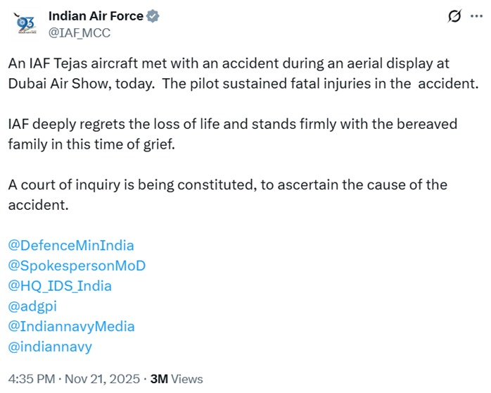 वायुसेना के बयान के मुताबिक, “दुबई एयर शो में हवाई प्रदर्शन के दौरान एक तेजस विमान दुर्घटनाग्रस्त हो गया। इस हादसे में पायलट को गंभीर चोटें आईं। वायुसेना इस दुखद घटना से बेहद व्यथित है और शोक संतप्त परिवार के साथ खड़ी है। दुर्घटना के असली कारण जानने के लिए कोर्ट ऑफ इन्क्वायरी बनाई जा रही है।”