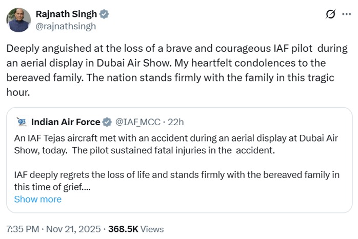 रक्षा मंत्री राजनाथ सिंह ने हादसे पर गहरा दुख जताया। उन्होंने कहा कि दुबई एयर शो के दौरान एक बहादुर भारतीय वायुसेना पायलट की जान जाना बेहद दुखद है। अपनी संवेदनाएँ व्यक्त करते हुए उन्होंने कहा कि उनकी हार्दिक श्रद्धांजलि और संवेदनाएँ शोक संतप्त परिवार के साथ हैं, और इस कठिन समय में पूरा राष्ट्र उनके साथ खड़ा है।