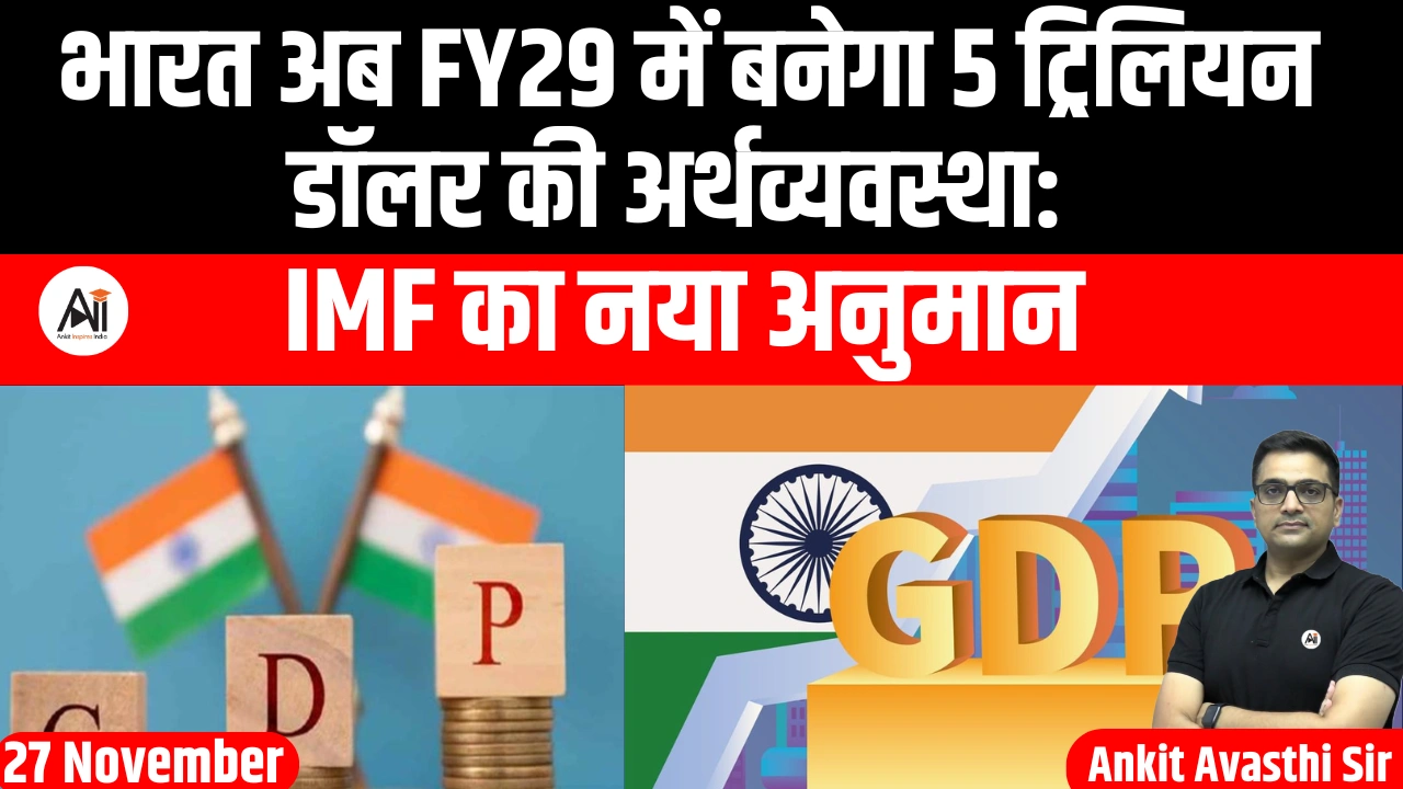 अंतरराष्ट्रीय मुद्रा कोष (IMF) की 26 नवंबर को जारी ताज़ा स्टाफ कंसल्टेशन रिपोर्ट के अनुसार, भारत अब FY29 में जाकर ही 5 ट्रिलियन डॉलर की अर्थव्यवस्था बनेगा। यह लक्ष्य पहले FY28 के लिये अनुमानित था, लेकिन अब इसे 1 साल पीछे कर दिया गया है।