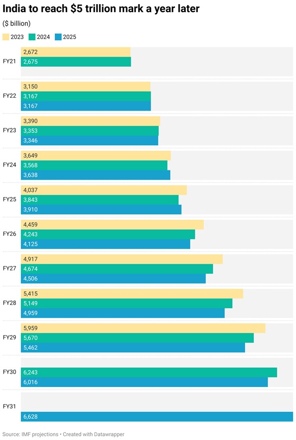 यानी FY28 में 5 ट्रिलियन का लक्ष्य थोड़ा सा चूक जाएगा। फरवरी 2025 में IMF ने FY28 के लिए $5.15 ट्रिलियन का अनुमान दिया था, अब यह लगभग $200 बिलियन कम है।