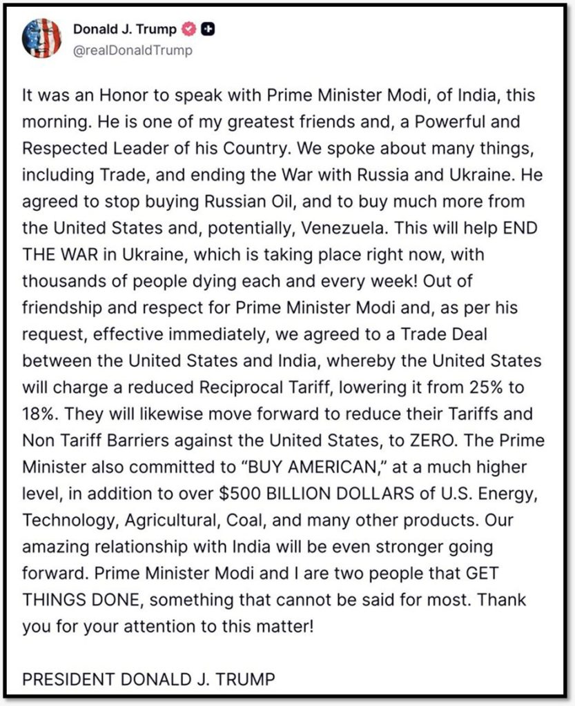 ट्रम्प के मुताबिक, प्रधानमंत्री मोदी ने रूसी तेल पर निर्भरता समाप्त करने की सहमति दी है। अब भारत अमेरिका से अधिक मात्रा में तेल खरीदेगा। इसके अतिरिक्त वेनेजुएला से भी तेल आयात की संभावना तलाशी जाएगी। ट्रम्प का मानना है कि यह कदम यूक्रेन युद्ध को समाप्त करने में सहायक होगा, जहां प्रत्येक सप्ताह हजारों लोग मारे जा रहे हैं।