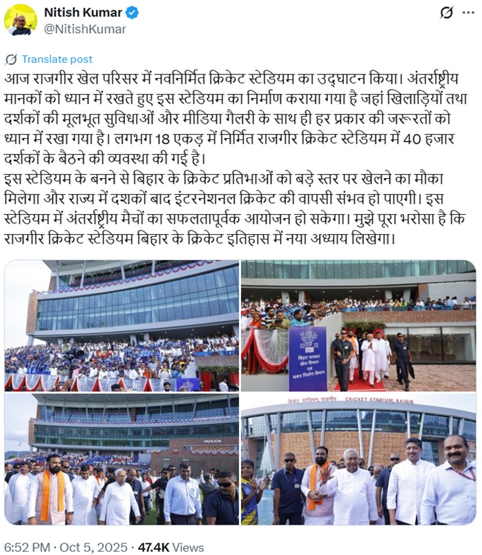 “आज राजगीर खेल परिसर में नवनिर्मित क्रिकेट स्टेडियम का उद्घाटन किया। अंतर्राष्ट्रीय मानकों को ध्यान में रखते हुए इस स्टेडियम का निर्माण कराया गया है, जहां खिलाड़ियों तथा दर्शकों की मूलभूत सुविधाओं और मीडिया गैलरी के साथ ही हर प्रकार की जरूरतों को ध्यान में रखा गया है। लगभग 18 एकड़ में निर्मित राजगीर क्रिकेट स्टेडियम में 40 हजार दर्शकों के बैठने की व्यवस्था की गई है।”