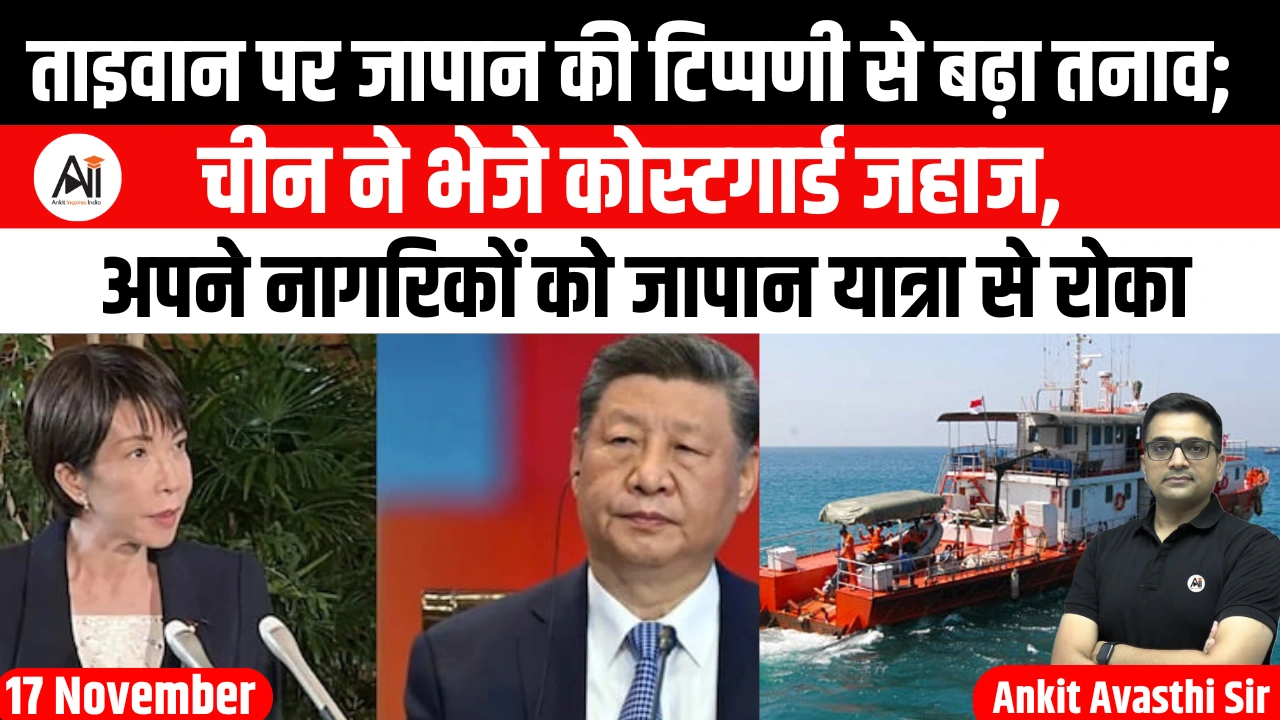ताइवान को लेकर जापान की प्रधानमंत्री साने ताकाइची के हालिया बयान के बाद पूर्वी एशिया में तनाव बढ़ गया है। इसी बीच चीन ने जापान-नियंत्रित सेनकाकू द्वीपसमूह (जिसे वह दियाओयू कहता है) के पास अपने कोस्टगार्ड जहाज भेजे हैं। इसी कारण चीन के विदेश मंत्रालय ने सोमवार को कहा कि ताइवान को लेकर बढ़ते तनाव के बीच, चीन के प्रधानमंत्री ली कियांग की दक्षिण अफ्रीका में आगामी जी-20 शिखर सम्मेलन के दौरान जापानी प्रधानमंत्री से मिलने की कोई योजना नहीं है।