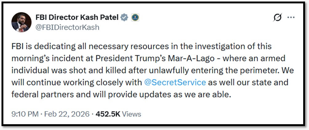 घटना के वक्त राष्ट्रपति ट्रम्प वॉशिंगटन डीसी स्थित व्हाइट हाउस में मौजूद थे। आम तौर पर वह सप्ताहांत में मार-ए-लागो रिजॉर्ट में समय बिताते हैं, लेकिन इस बार वह वहां नहीं थे। अधिकारियों ने स्पष्ट किया है कि राष्ट्रपति किसी भी तरह के खतरे में नहीं थे।