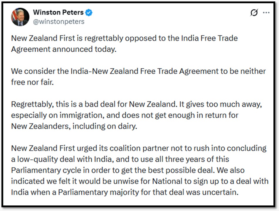 उन्होंने कहा कि न्यूजीलैंड फर्स्ट ने अपने गठबंधन साझेदार (नेशनल पार्टी) से आग्रह किया था कि वे “भारत के साथ एक निम्न-गुणवत्ता वाले सौदे को जल्दबाजी में समाप्त न करें” और इसके बजाय बेहतर परिणाम के लिए पूरे संसदीय कार्यकाल का उपयोग करें। पीटर्स ने कहा, “दुर्भाग्य से, इन अनुरोधों पर ध्यान नहीं दिया गया।” उन्होंने नेशनल पार्टी पर आरोप लगाया कि उन्होंने “एक त्वरित, निम्न-गुणवत्ता वाले सौदे को करने को प्राथमिकता दी, जबकि उन्हें एक निष्पक्ष सौदा प्राप्त करने के लिए आवश्यक कठिन परिश्रम करना चाहिए था जो न्यूजीलैंडवासियों और भारतीयों दोनों के लिए लाभदायक हो।”