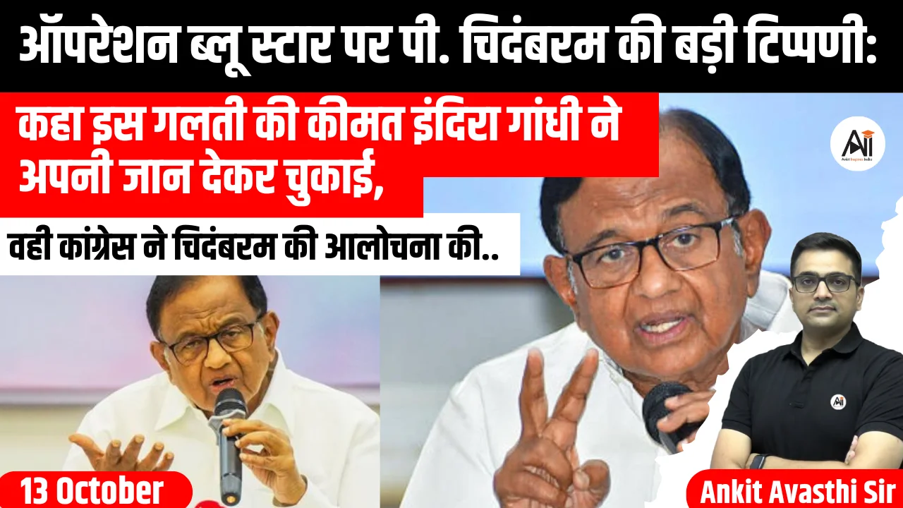 ऑपरेशन ब्लू स्टार 1 से 10 जून 1984 के बीच भारतीय सेना द्वारा चलाया गया एक बड़ा और विवादास्पद अभियान था। इसका उद्देश्य सिख उग्रवादी नेता जरनैल सिंह भिंडरांवाले और उनके समर्थकों को अमृतसर के स्वर्ण मंदिर से बाहर निकालना था। इंटरव्यू के दौरान चिदंबरम ने इस बात पर आपत्ति भी जताई कि भिंडरावाले को गांधी ने “बनाया” था। स्वर्ण मंदिर सिख धर्म का सबसे पवित्र स्थल है, इसलिए यह कार्रवाई बहुत संवेदनशील साबित हुई।