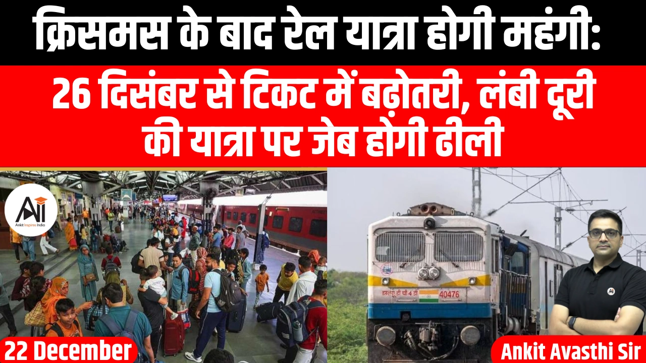 यदि आप क्रिसमस के बाद लंबी ट्रेन यात्रा की योजना बना रहे हैं, तो आपका टिकट थोड़ा अधिक महंगा हो सकता है। 26 दिसंबर से एसी कोचों और नॉन-एसी मेल तथा एक्सप्रेस ट्रेनों में यात्रा करने वाले यात्रियों को किराए में मामूली वृद्धि का सामना करना पड़ेगा। भारतीय रेलवे ने प्रति किलोमीटर 2 पैसे की दर से टिकट मूल्य संशोधित किया है।