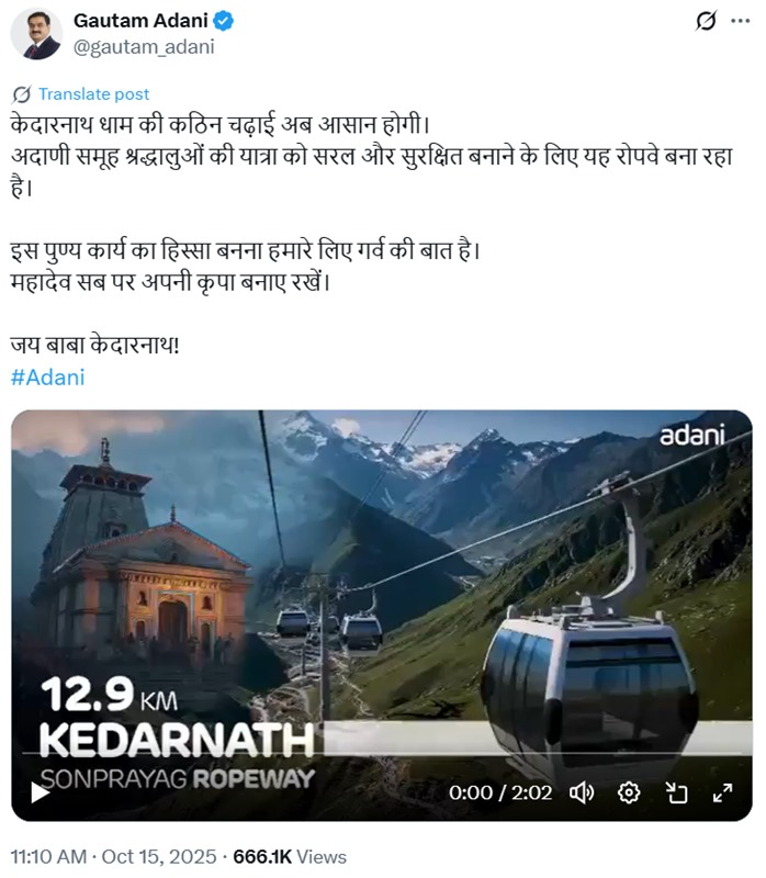 अब केदारनाथ धाम की कठिन चढ़ाई आसान हो जाएगी। अडानी समूह श्रद्धालुओं की यात्रा को सरल और सुरक्षित बनाने के लिए यह रोपवे बना रहा है। उन्होंने आगे कहा, “इस पवित्र काम का हिस्सा बनना हमारे लिए गर्व की बात है। महादेव सभी पर अपनी कृपा बनाए रखें। जय बाबा केदारनाथ!”