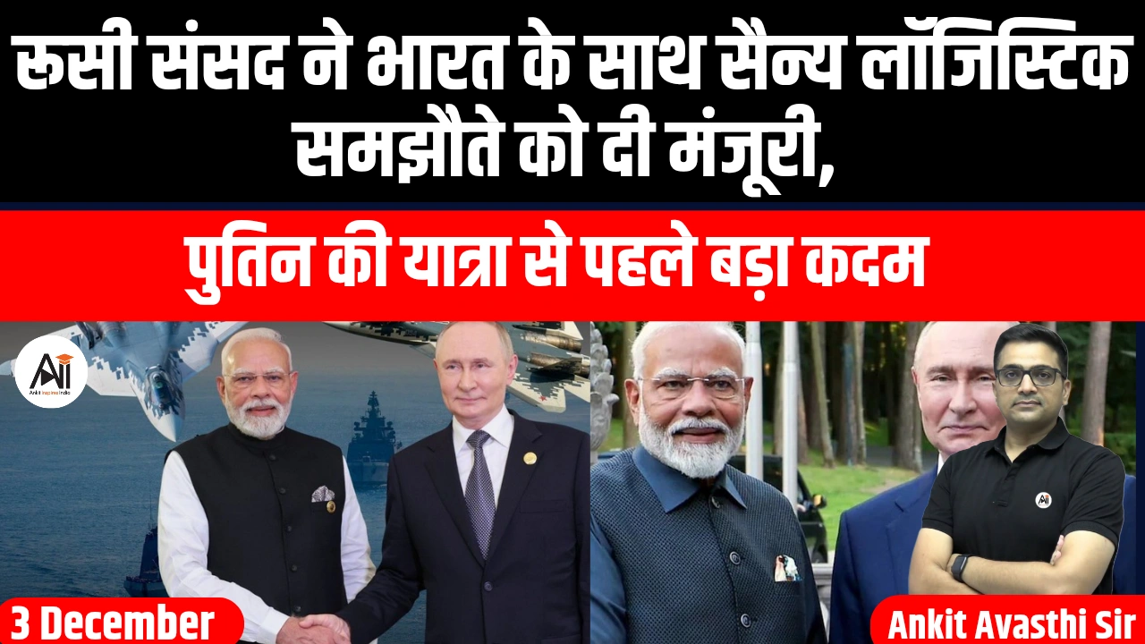 राष्ट्रपति व्लादिमीर पुतिन की भारत यात्रा से महज दो दिन पहले रूस की संसद के निचले सदन स्टेट ड्यूमा ने मंगलवार को भारत के साथ एक अहम सैन्य समझौते को औपचारिक मंजूरी दे दी है। इस समझौते का नाम रेसिप्रोकल एक्सचेंज ऑफ लॉजिस्टिक सपोर्ट (RELOS) है, जिस पर 18 फरवरी को हस्ताक्षर किए गए थे।