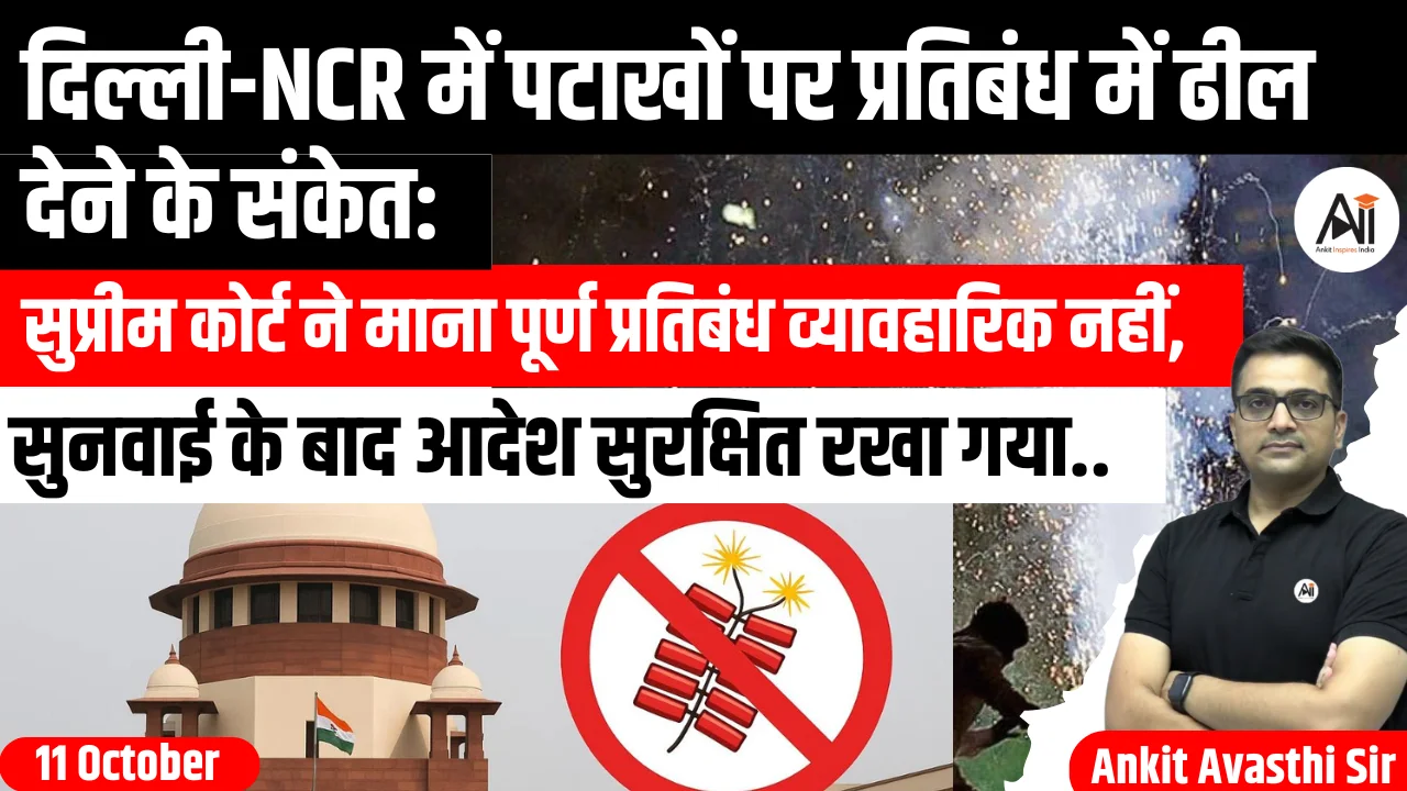 सुप्रीम कोर्ट ने दिवाली से कुछ दिन पहले दिल्ली-एनसीआर में पटाखों पर बैन को लेकर सुनवाई की। अदालत ने कहा कि पटाखों पर पूर्ण प्रतिबंध व्यावहारिक नहीं है और अक्सर इसका उल्लंघन होता है। कोर्ट ने दिवाली पर केवल हरित पटाखों (ग्रीन पटाखों) के इस्तेमाल और बिक्री की संभावना पर फैसला सुरक्षित रख लिया है और संकेत दिया कि दिवाली के दौरान पाँच दिनों के लिए परीक्षण के तौर पर पटाखों की बिक्री और फोड़ने की अनुमति दी जा सकती है। प्रतिबंध में ढील देने के पक्ष में देखी जा रही इन टिप्पणियों ने पूरी दिल्ली में राहत और चिंता दोनों पैदा कर दी है।