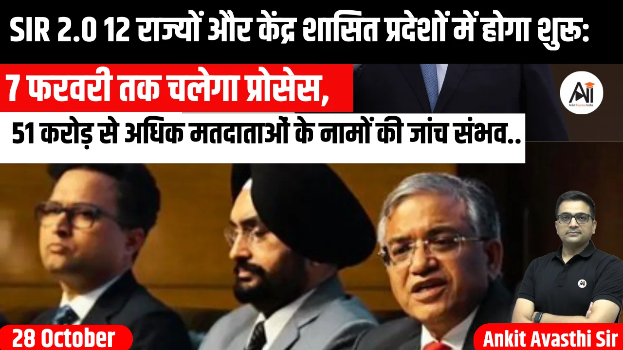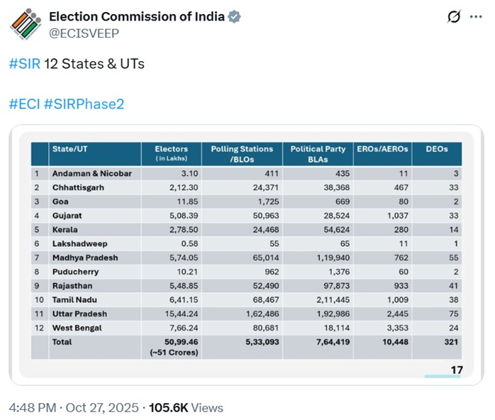 भारत निर्वाचन आयोग ने सोमवार को घोषणा की कि देश के 12 राज्यों और केंद्र शासित प्रदेशों में मतदाता सूची के विशेष गहन पुनरीक्षण (SIR) का दूसरा चरण 28 अक्टूबर से शुरू होगा। इस अभियान के तहत 51 करोड़ से अधिक मतदाताओं के नामों की जांच की जाएगी ताकि मतदाता सूचियों को सटीक और त्रुटिरहित बनाया जा सके।